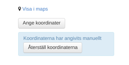 Nu går det att ange koordinater för objekt (på samma sätt som vi har idag i arbetsorder). Detta görs under ”Ändra”, sektionen: ”Adress”. Om man anger koordinater så är det dessa som kommer att användas i kartan.