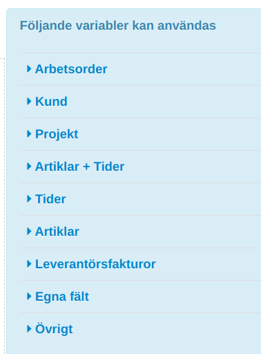 Det har under åren blivit en hel del variabler som man kan använda för att skapa E-post och PDF-mallar och nu var det dags att snygga till det lite. Vi har nu gjort så att variabler grupperas istället för att ha en enda lång lista.