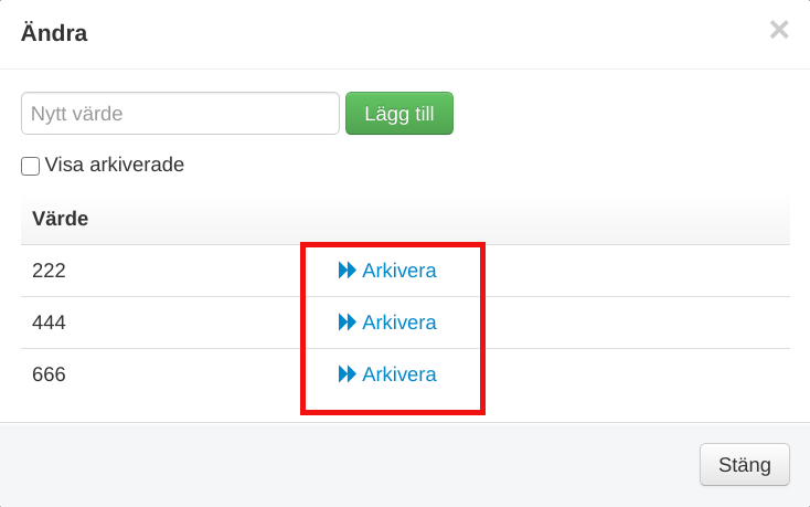I egna fält för tider och artiklar så finns två typer som tillåter att värden läggs till ”dynamiskt”. Nu finns möjlighet att även arkivera värden så att de inte visas i framtiden.