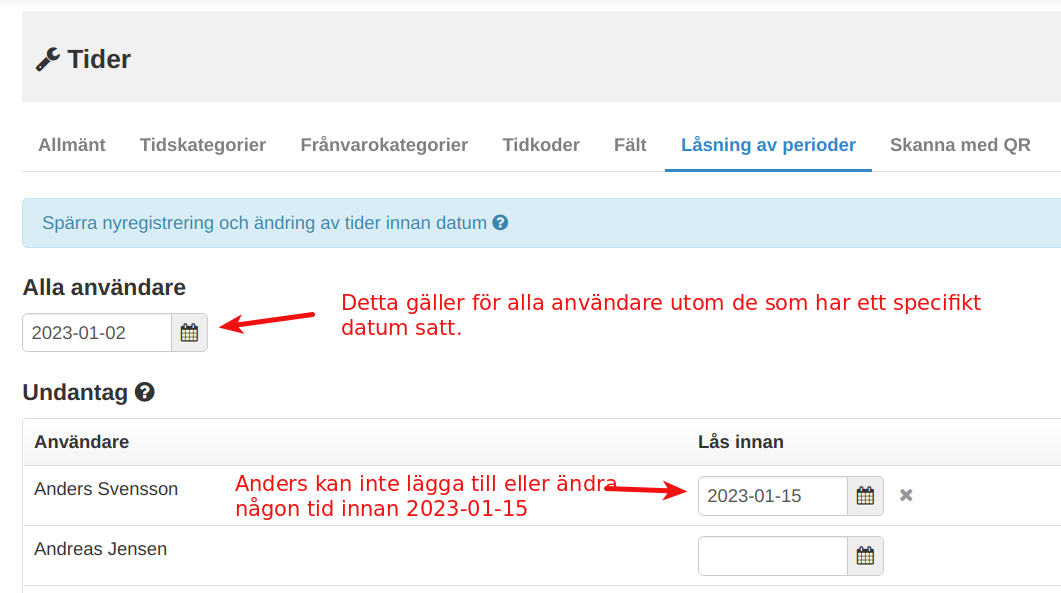 Tider – Lås period för registrering/ändring endast för vissa användare