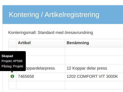 När man har en leverantörsfaktura som innehåller artikelrader så kan man nu se om de har skapats (grön ikon) eller om de inte har skapats (röd ikon). Det går att hovra över ikonen för att se vart artikeln finns samt varifrån påslaget har tagits.