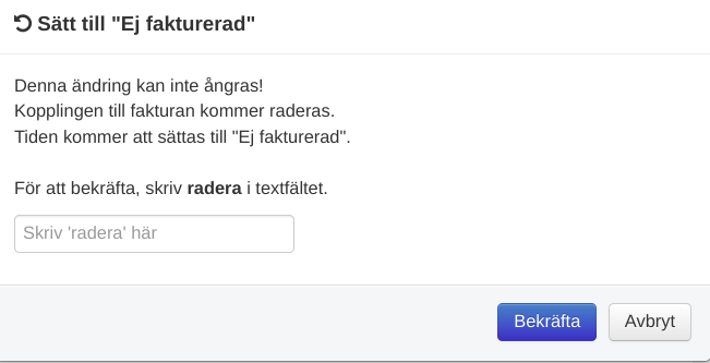 Det har inte varit möjligt att ta bort ”Fakturerad”-flaggan från tider, artiklar, etc, ifall en sådan har varit med i en faktura (via ”Generera faktura”). Nu har vi tagit bort den ”begränsningen” så nu går det att ta bort den flaggan genom att gå in på ex. tiden och välja ”Sätt till ”Ej fakturerad””. Använd funktionen med försiktighet eftersom att det kan innebära att ni fakturerar mer än en gång för samma sak.