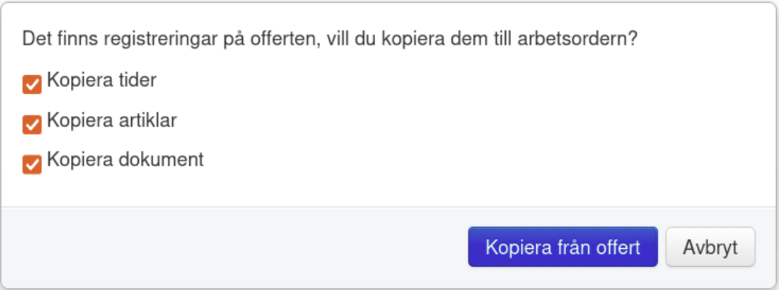 När man kopplar en offert från en arbetsorder så kontrolleras nu om det finns några tider, artiklar och dokument på offerten och om det finns så får man alternativet att kopiera dessa.
