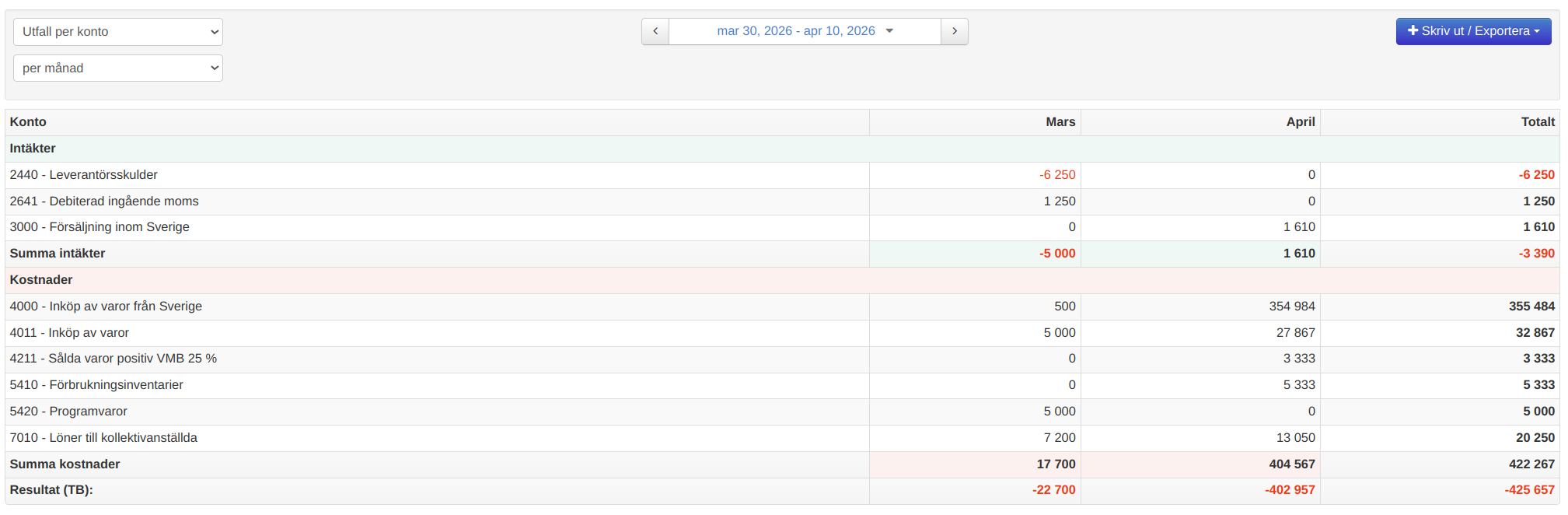 En ny rapport, ”Utfall per konto”, har lagts till i ”Rapporter -> Statistik”. Rapporten ger en samlad vy över ekonomiskt utfall fördelat
