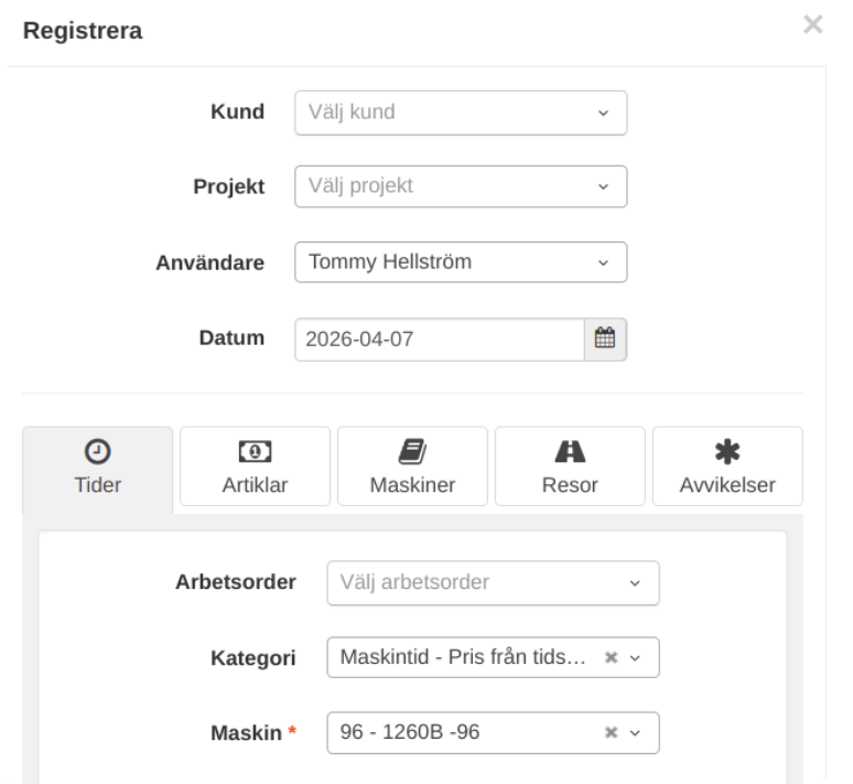 Vi har lagt till möjligheten att kunna ha arbetsorder-väljaren för respektive registrering istället för som det är nu att vald kund, projekt och arbetsorder påverkar all registrering. Detta gör det möjligt att registrera tid, artiklar, etc på olika arbetsordrar (så länge de har samma kund/projekt) utan att behöva stänga registreringen.