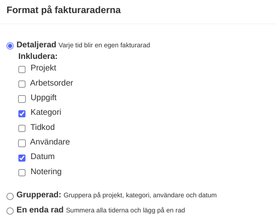 Dessutom så används inställningarna som visas inne på arbetsordern (”Format för fakturaraderna”) även vid generering av artiklar och det gäller fälten: Projekt, Arbetsorder, Användare, Datum och Notering.