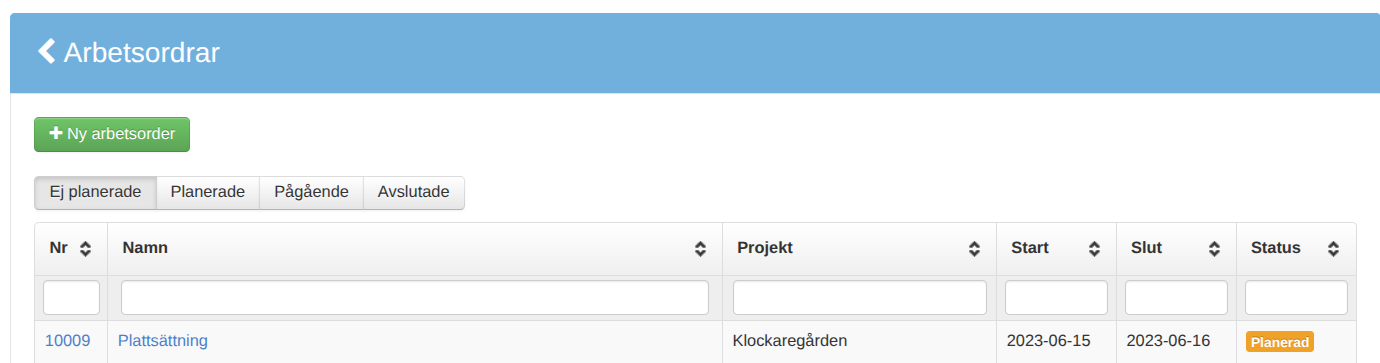 I arbetsorderlistan finns nu kolumnen ”Resultatenhet”. Det går att sortera och filtrera på den precis som med de flesta andra kolumnerna.